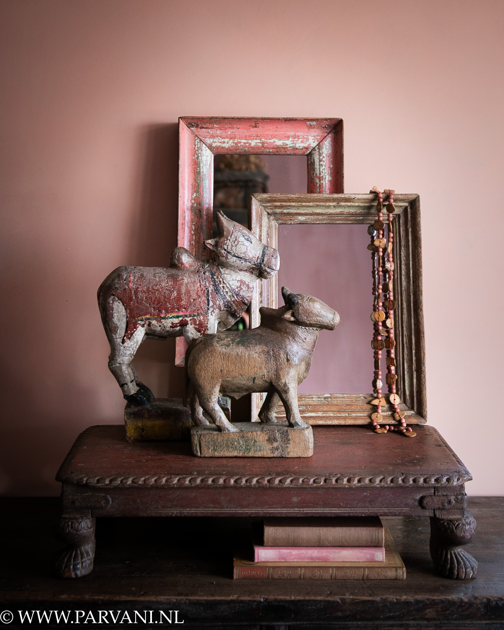 Indiase woonaccessoires, oud houten bajot tafeltje met kleine spiegels en unieke oude nandi's