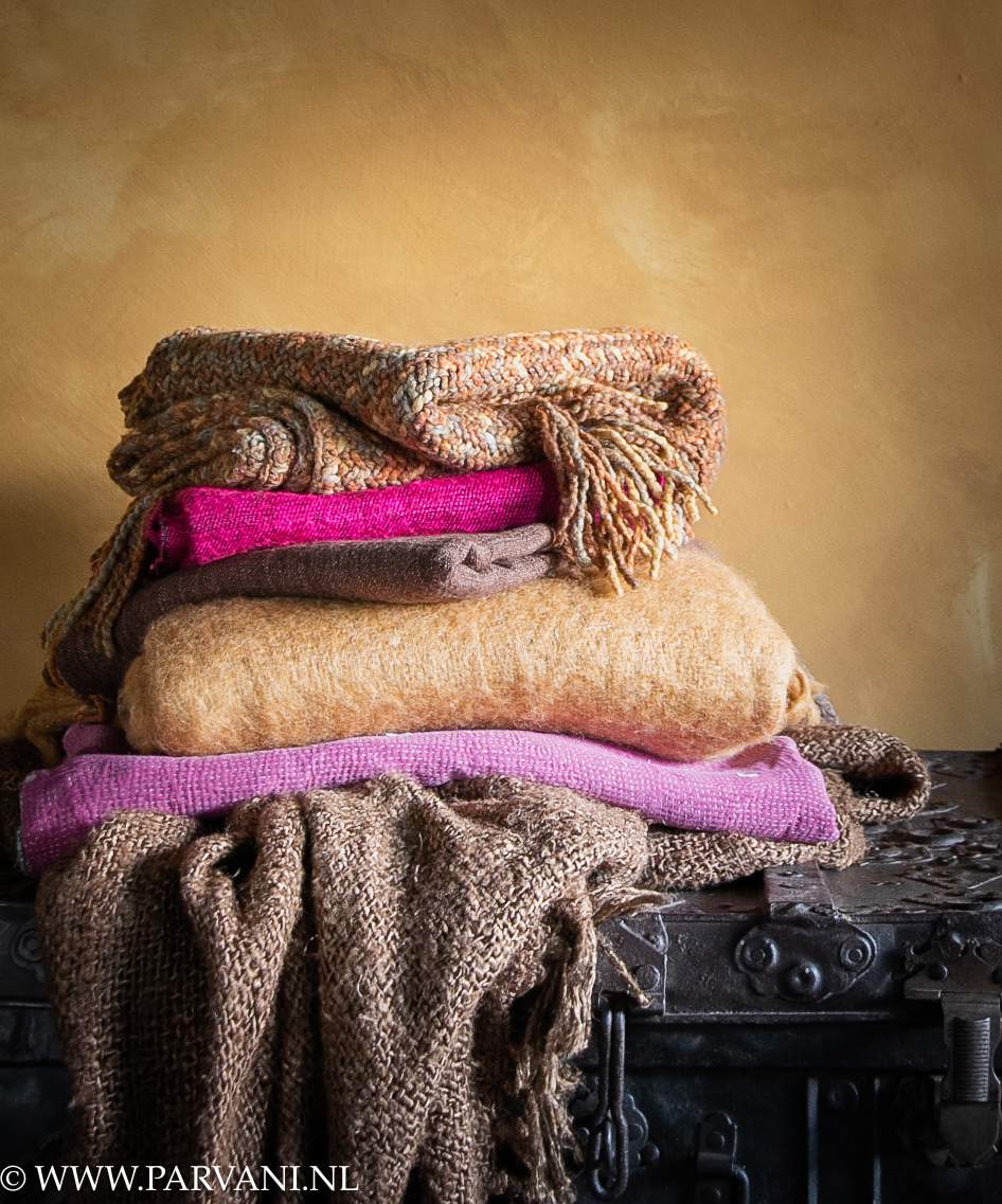 Stapel kleurrijke plaids en sjaals in warme kleuren oker, geel, bruin en roze op oude ijzeren koffer uit India