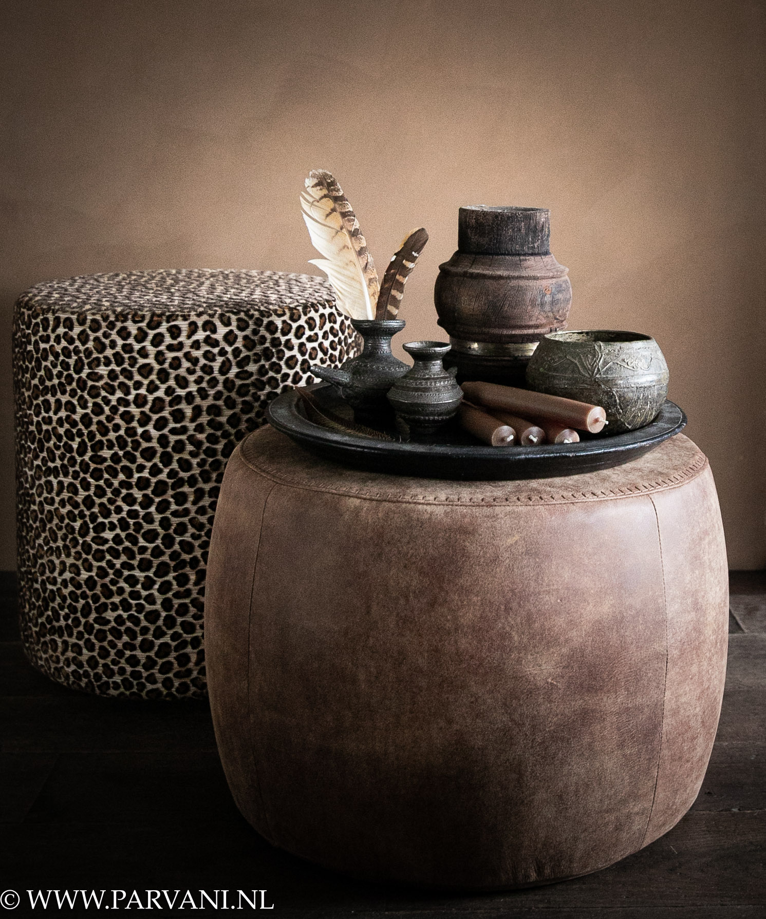 Ronde poef van cognac bruin geschuurd leer met stoere stiksels en hogere poef met leopard stof